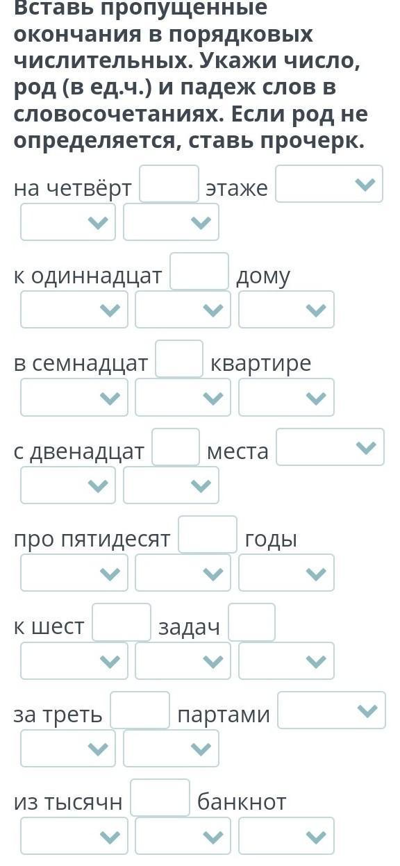 Вставь пропущенные окончания в порядкоВЫХ числительных. Укажи число, род (в ед.ч.) и падеж слов в словосочетаниях. Если род не определяется, ставь прочерк. на четвёрт к одиннадцат в семнадцат с двенадцат про пятидесят к шест за треть из тысячН этаже дому квартире места задач годы партами банкнот.