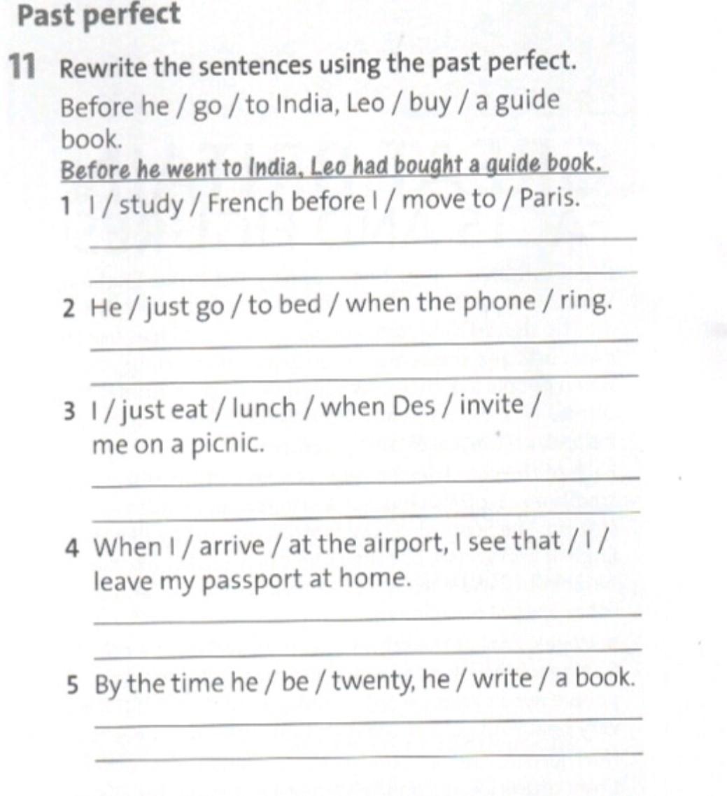 ПОЖАЛУЙСТА ПОМОГИТЕ!!!! Past perfect 11 Rewrite the sentences using the past perfect. Before he/go/to India, Leo/buy/ a guide book. Before he went to India, Leo had bought a guide book. 11/study/French before I / move to / Paris. 2 He/just go/to bed/when the phone/ring.. 31/just eat/lunch/when Des/invite/ me on a picnic. 4 When I/arrive / at the airport, I see that/1/ leave my passport at home. 5 By the time he /be/twenty, he/write / a book.