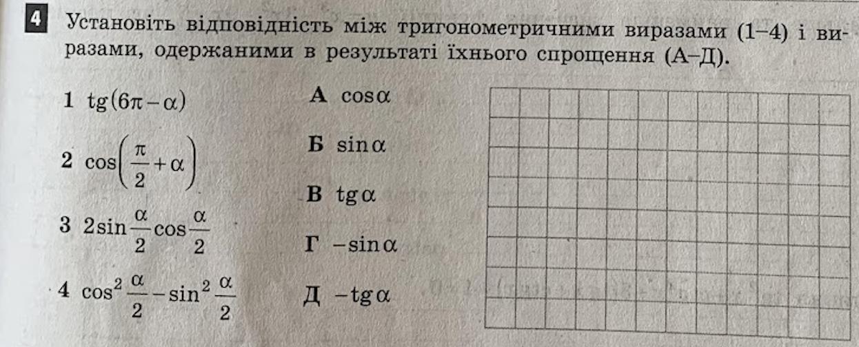 Установіть відповідність між тригонометричними виразами (1-4) і виразами, одержаними в результаті їхнього спрощення (А-Д)