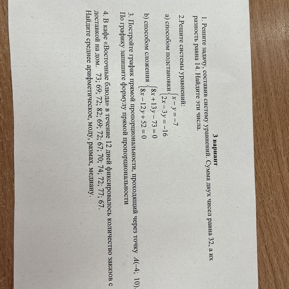 1. Решите задачу, составив систему уравнений. Сумма двух чисел равна 32, а их