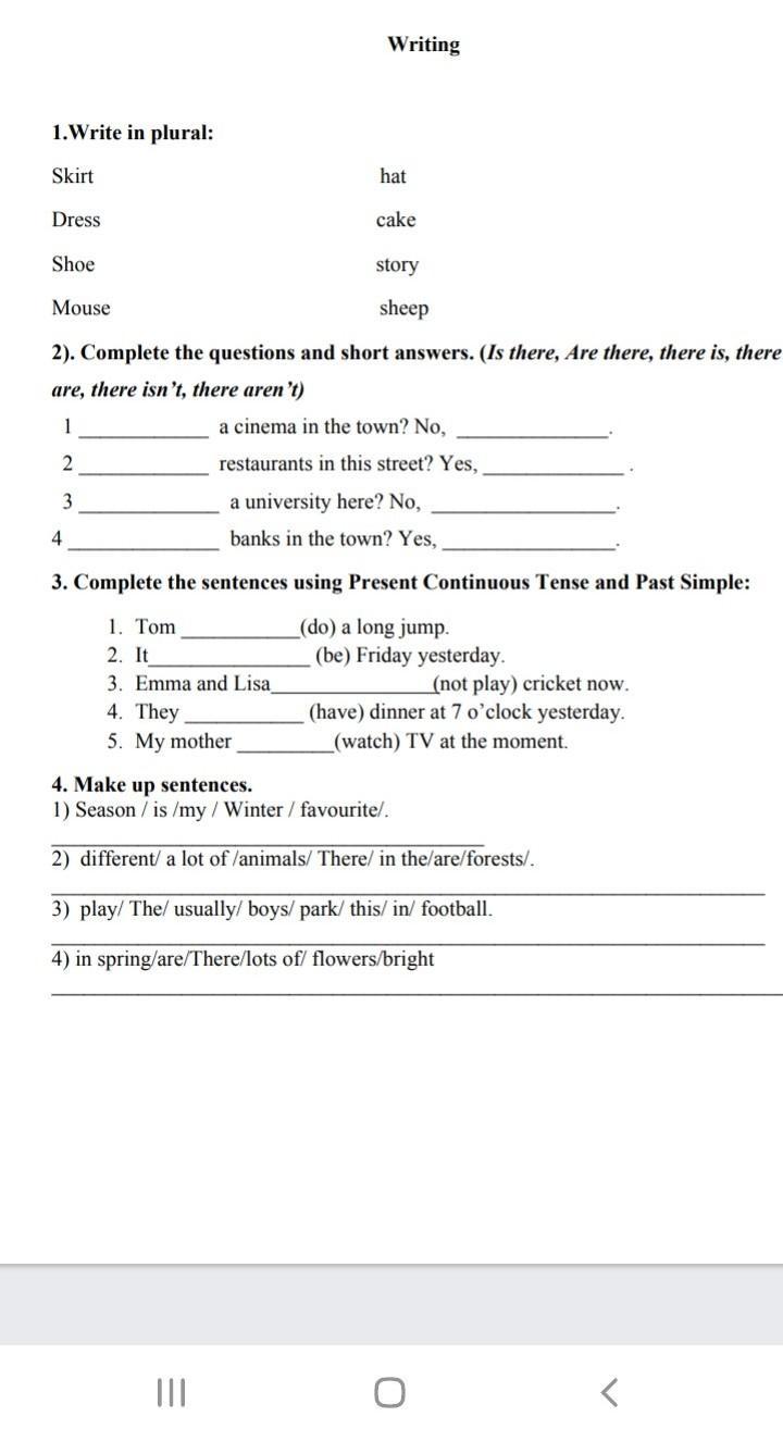 Упраж 4. 1. My favourite season is Winter. 2. Are there a lot of different animals in the forests? 3. The boys usually play football in this park. 4. There are lots of bright flowers in spring.