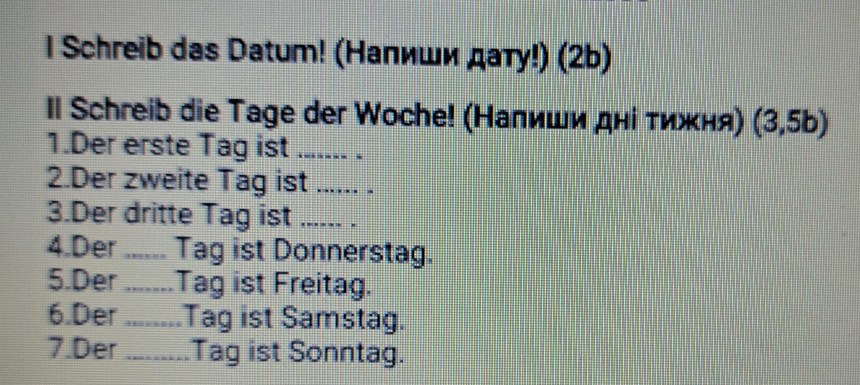Ответ: 1. Montag, 2. Dienstag, 3. Mittwoch, 4. Vierte, 5. Fünfte, 6. sechste, 7. siebte