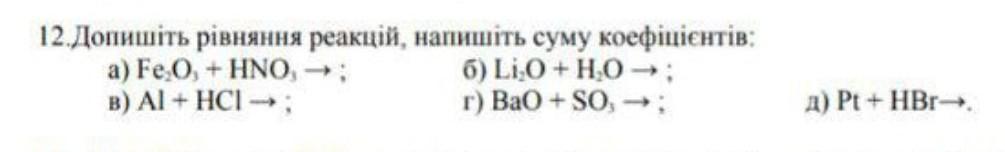 12.Допишіть рiвняння реакцій, напишіть суму коефіцієнтів: 6) LiO+H,O a) Fe,O, + HNO, -; B) Al + HCl - г) BaO + SO, - д) Pt + HBr
