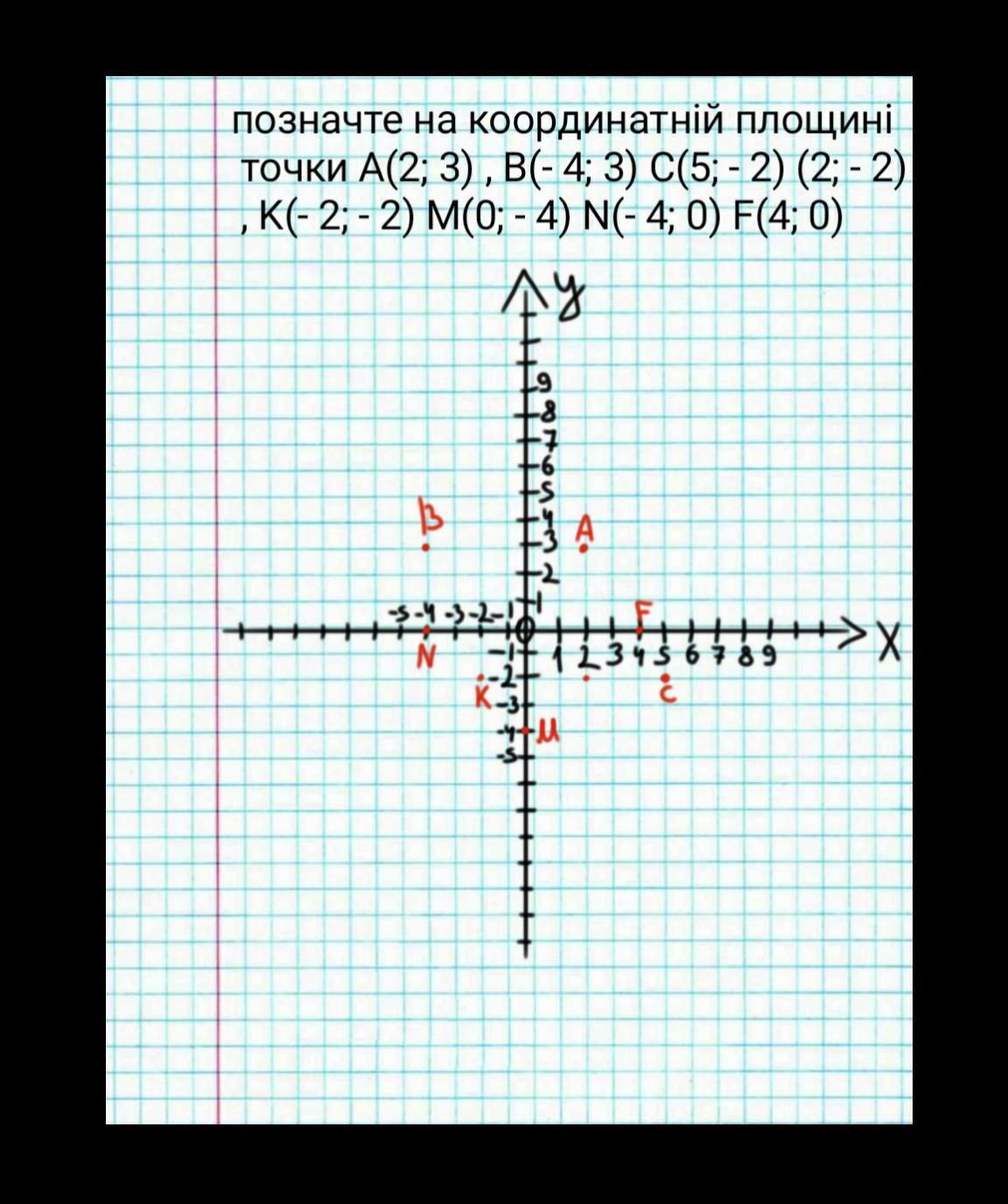 позначте на координатній площині точки A(2; 3) , B(- 4; 3) C(5; - 2) (2; - 2) , K(- 2; - 2) M(0; - 4) N(- 4; 0) F(4; 0)