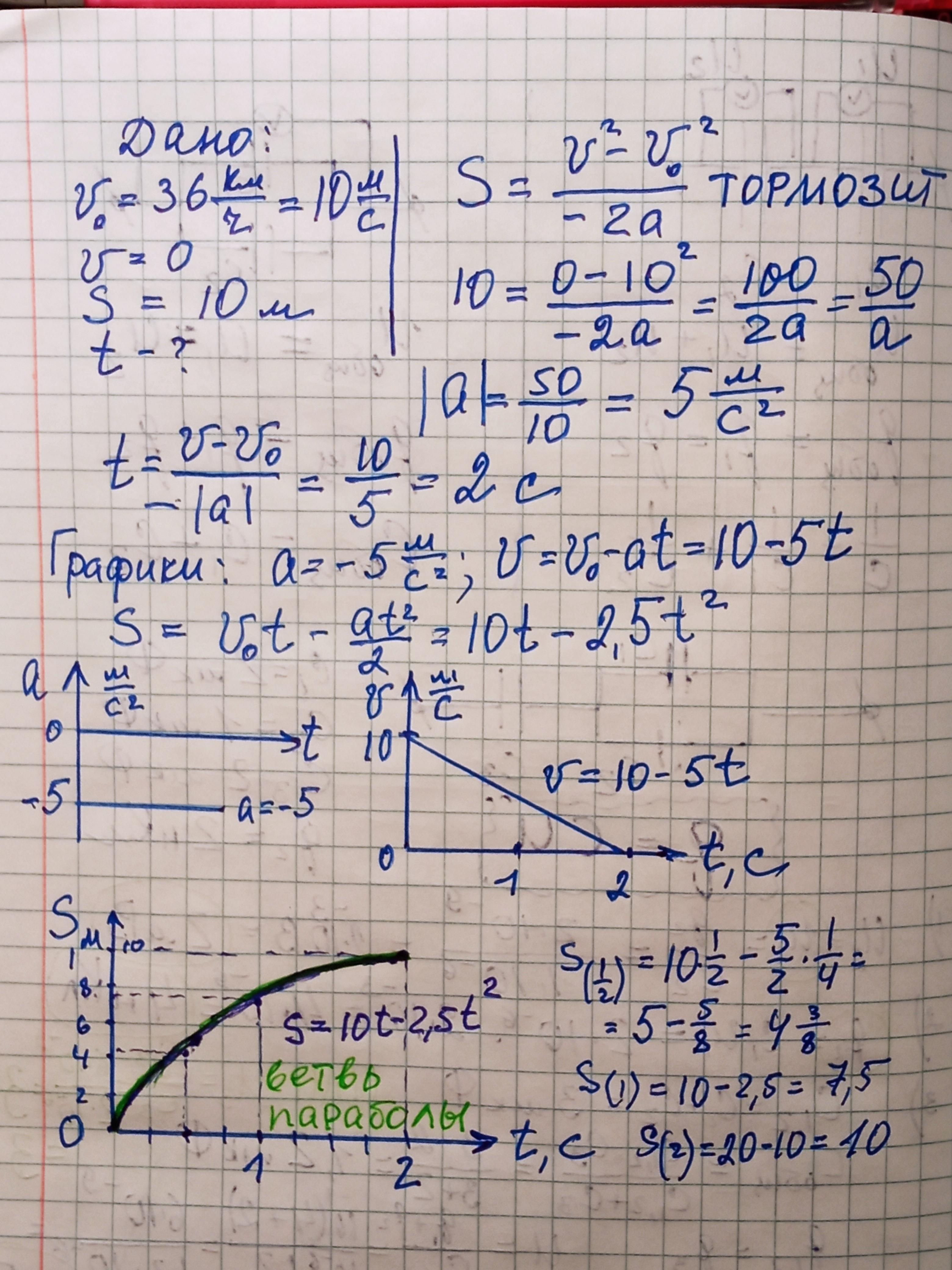 Автомобіль рухаючись зі швидкістю 36 км/год, рівноприскорено гальмує, зупиняючись через 10 м. Визначити час гальмування та прискорення автомобіля. Побудувати графіки залежності від часу проекцій швидкості, переміщеня та прискорення автомобіля
