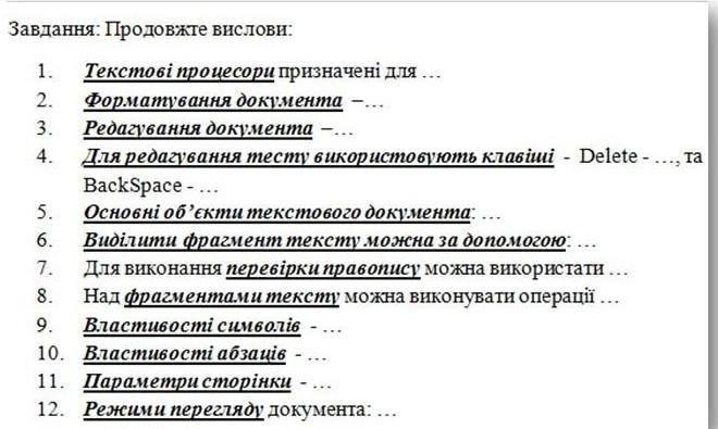 Завдання: Продовжте вислови: 1. Текстові процесори призначені для ... 2. Форматування документа 3. Редагування документа 4. Для редагування месту використовують клавіші - Delete - ..., та BackSpace -... 5. Основні об'єкти текстового документа: 7. 6. Виділити фрагмент тексту можна за допомогою ... Для виконання перевірки правопису можна використати... Над фрагментами тексту можна виконувати операції ... 9. Властивості символів 8. 10. Властивості абзацiв 11. Параметри сторінки 12. Режими перегляду документа: ... - - ...