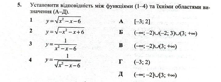 установити відповідність між функціями (1-4) та їхніми областями визначення (А-Д).