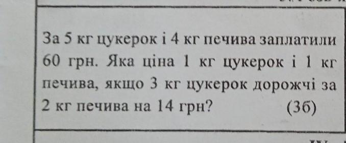 За 5 кг цукерок і 4 кг печева заплатили 60 грн.Яка ціна 1кг цукерок і 1 кг печева, якщо 3 кг цукерок дорожчі за 2 кг печева на 14 грн?