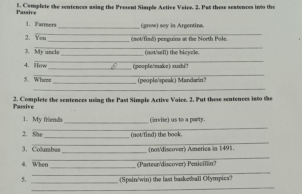 1. Complete the sentences using the Present Simple Active Voice. 2. Put these sentences into the Passive 1. Farmers 2. You 3. My uncle 4. How 5. Where 1. My friends 2. She 2. Complete the sentences using the Past Simple Active Voice. 2. Put these sentences into the Passive 3. Columbus 4. When & 5. (grow) soy in Argentina. (not/find) penguins at the North Pole. (not/sell) the bicycle. (people/make) sushi? (people/speak) Mandarin? (invite) us to a party. (not/find) the book. (not/discover) America in 1491. (Pasteur/discover) Penicillin? (Spain/win) the last basketball Olympics?