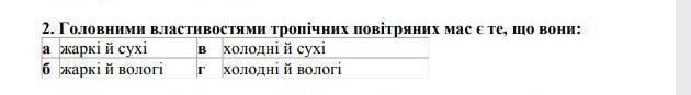 2. Головними властивостями тропічних повітряних мас є те, що вони: а жаркi й сухi B холоднi й сухi б жаркi й вологi г холоднi й вологi
