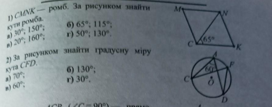 1 1) CMNK кути ромба. a) 30°; 150%; B) 20°; 160°; a) 70°; в) 60°; ромб. За рисунком знайти 6) 65°; 115%; r) 50°; 130°. 2) за рисунком знайти градусну міру кута CFD 6) 130°; г) 30º. ICB 1/5 - 00) navo M 65° 60% 8 D