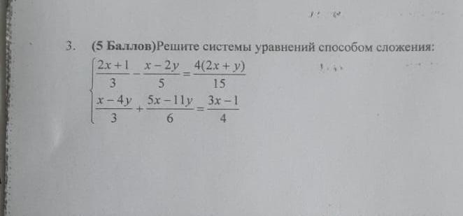( 2Х + 1 ) / 3 - ( Х - 2У ) / 5 = 4 × ( 2Х + У ) / 15 ( 1 )