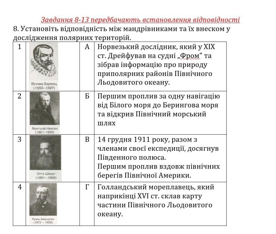 8. Установіть відповідність між мандрівниками та їх внеском у дослідження полярних територій. 1 у А | Норвезький дослідник, який у XIX ст. Дрейфував на судні „Фром" та зібрав інформацію про природу приполярних районів Північного Льодовитого океану. 2 3 4 Вiллем Баренц (1550-1597) Фритьоф Нансен (1861-1930) Отто Шмідт (1891-1956) Руаль Амундсен (1872-1928) Б Першим проплив за одну навігацію від Білого моря до Берингова моря та відкрив Північний морський ШЛЯХ B 14 грудня 1911 року, разом з членами своєї експедиції, досягнув Південного полюса. Першим проплив вздовж північних берегів Північної Америки. Г Голландський мореплавець, який наприкінці XVІ ст. склав карту частини Північного Льодовитого океану.