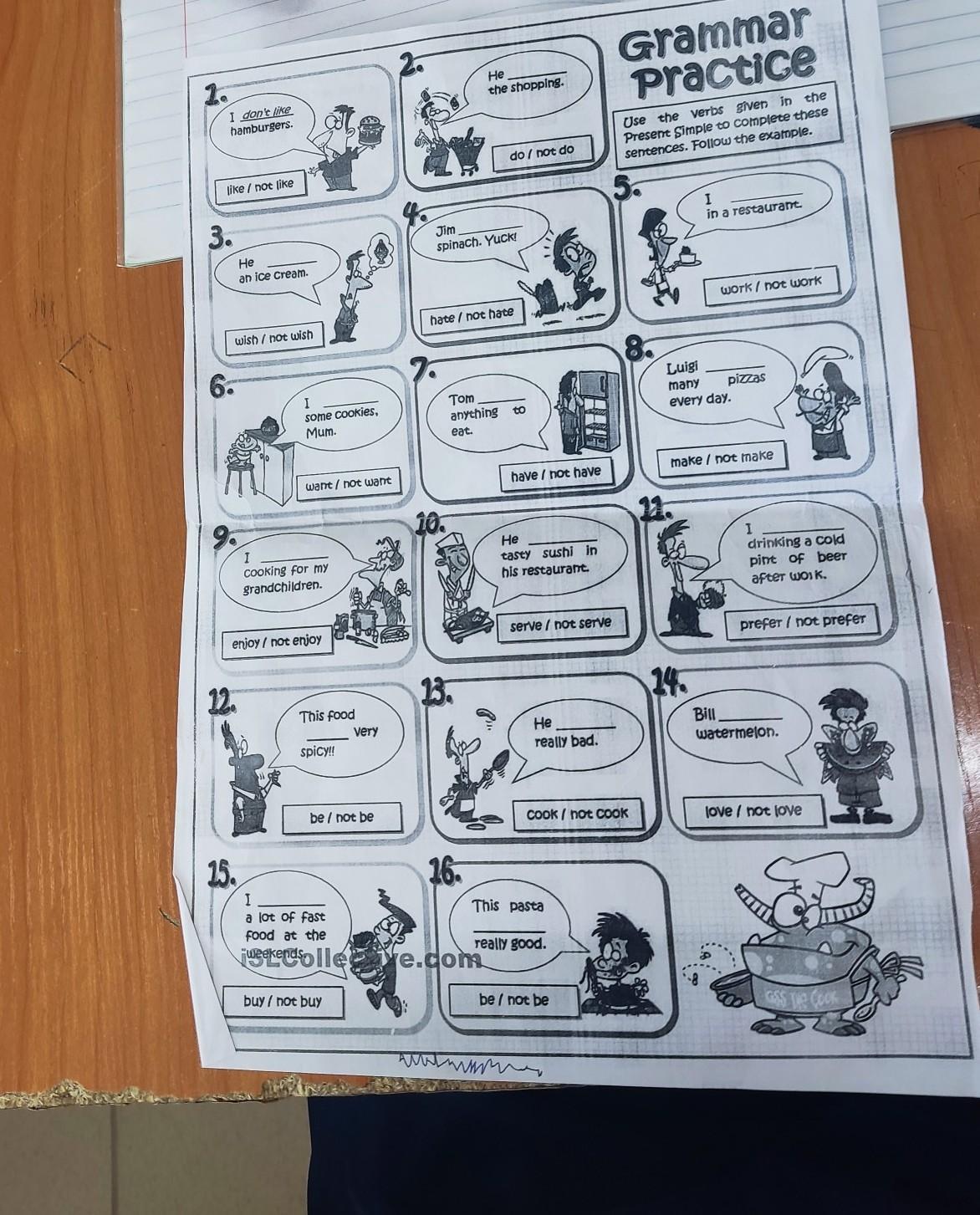 2. He does the shopping. 3. He wishes an ice cream. 4. Jim hates spinach. 5. I work in restaurant. 6. I want some cookies. 7. Tom doesn't have anything to eat. 8. Luigi doesn't make many pizzas every day. 9. I enjoy cooking for my grandchildren. 10. He serves tasty sushi in his restaurant. 11. I prefer drinking a cold pint of beer after work. 12. This food is very spicy. 13. He cooks really bad. 14. Bill loves watermelon. 15. I buy a lot of fast food at the weekends. 16. This pasta isn't really good.