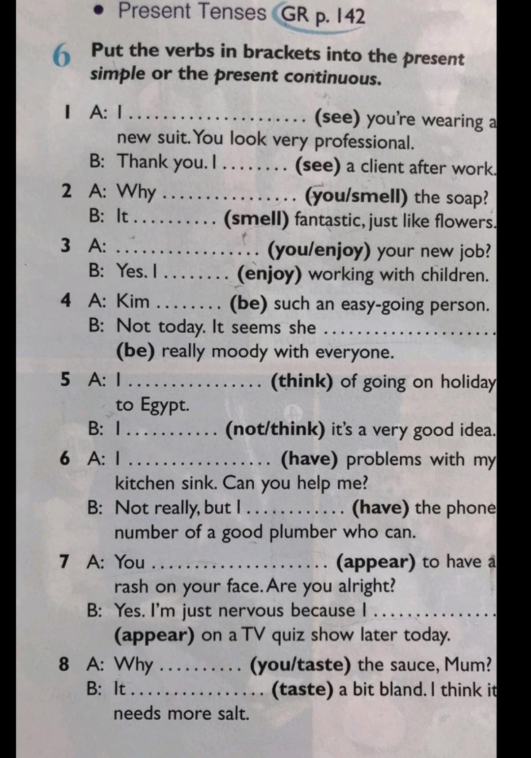 8. A: Why aren't you tasting the sauce, Mum? It tastes a bit bland. I think it needs more salt.