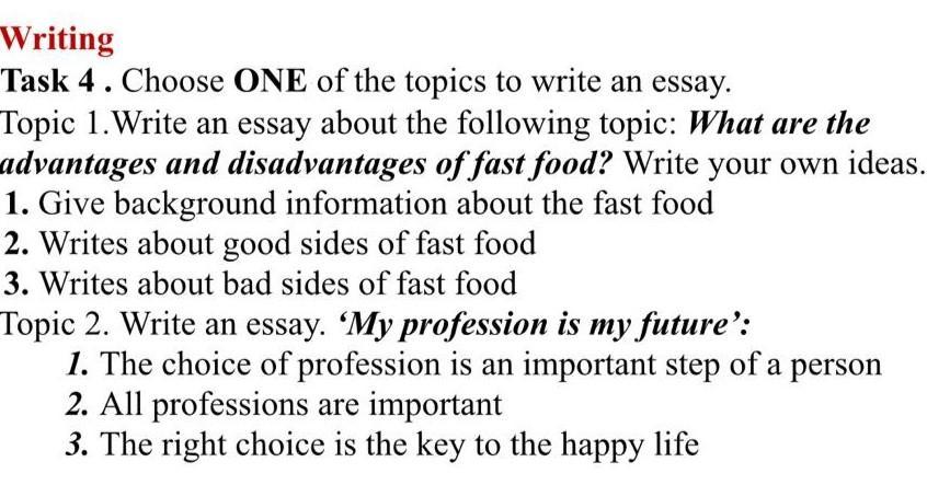 Task 4. Choose ONE of the topics to write an essay. Topic 1.Write an essay about the following topic: What are the advantages and disadvantages of fast food? Write your own id 1. Give background information about the fast food 2. Writes about good sides of fast food 3. Writes about bad sides of fast food Topic 2. Write an essay. 'My profession is my future': 1. The choice of profession is an important step of a perso 2. All professions are important 3. The right choice is the key to the happy life СРОЧНО ПОМОГИТЕЕЕЕЕ