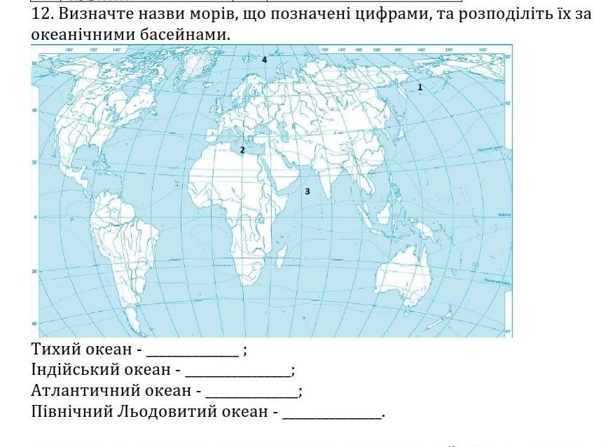 12. Визначте назви морів, що позначені цифрами, та розподіліть їх за океанічними басейнами. Тихий океан - Індійський океан - Атлантичний океан - Північний Льодовитий океан