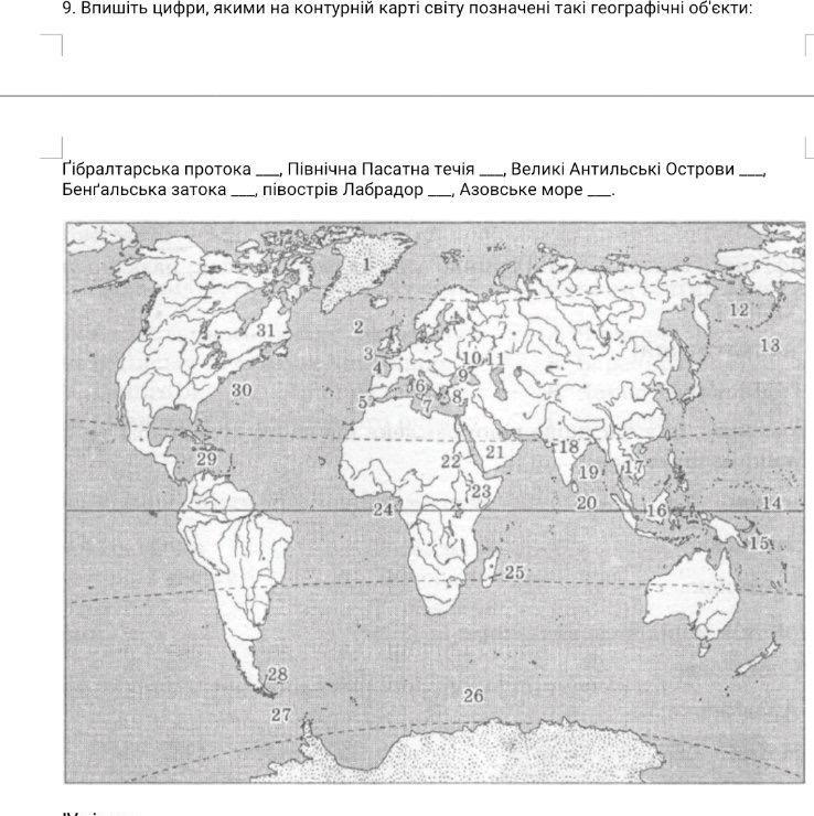 Ґібралтарська протока 5, Північна Пасатна течія 30, Великі Антильські острови 29, півострів Лабрадор 31, Азовське море 10.