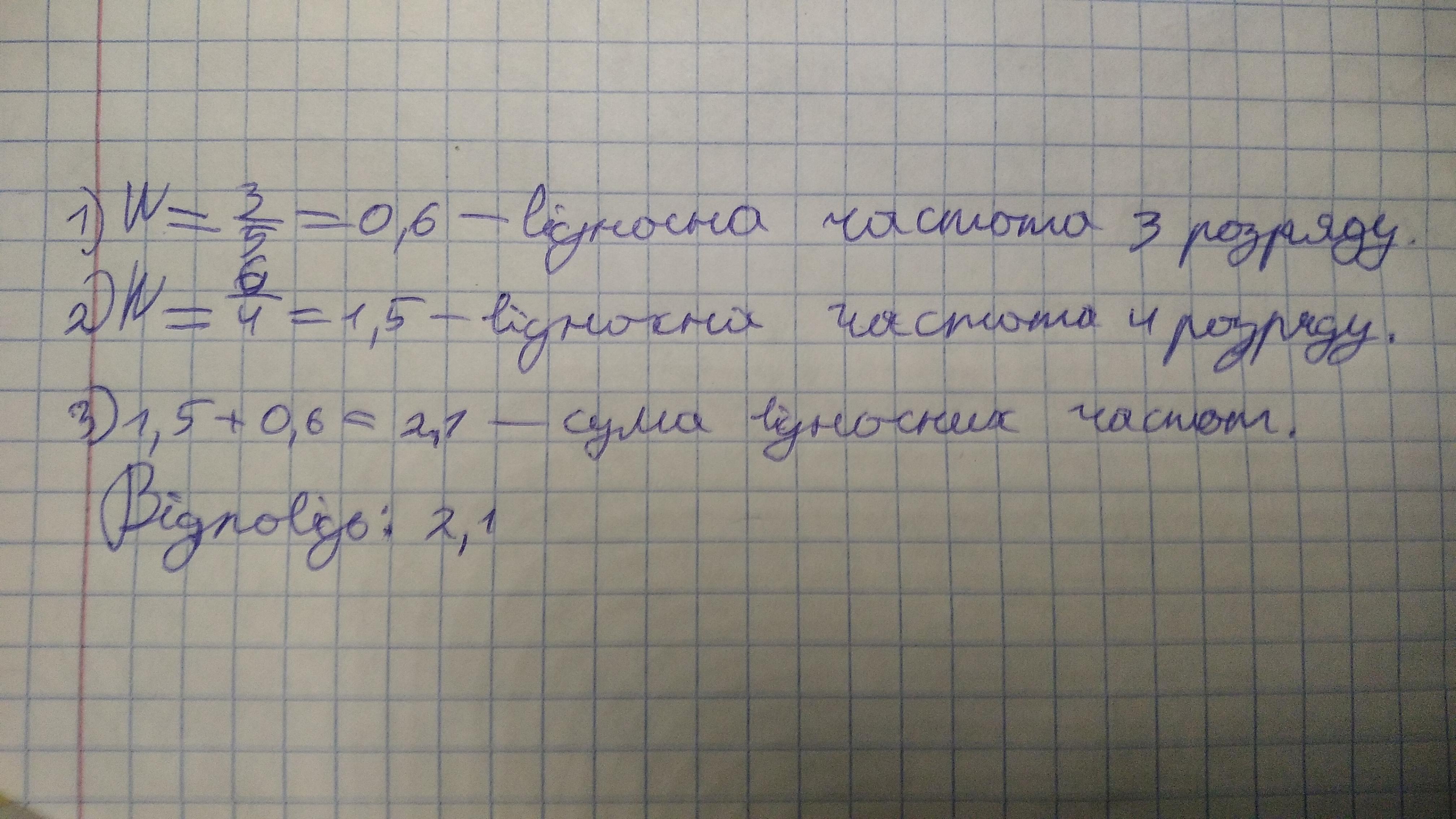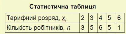 Користуючись статистичною таблицею, визначте відносну частоту робітників третього і четвертого розрядів. У віповідь запишіть суму відносних частот робітників третього і четвертого розрядів ( запишіть без відсотків).