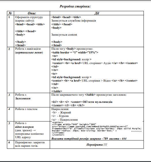 Створити текстовий документ → Прописати каркас web (додати контент) →