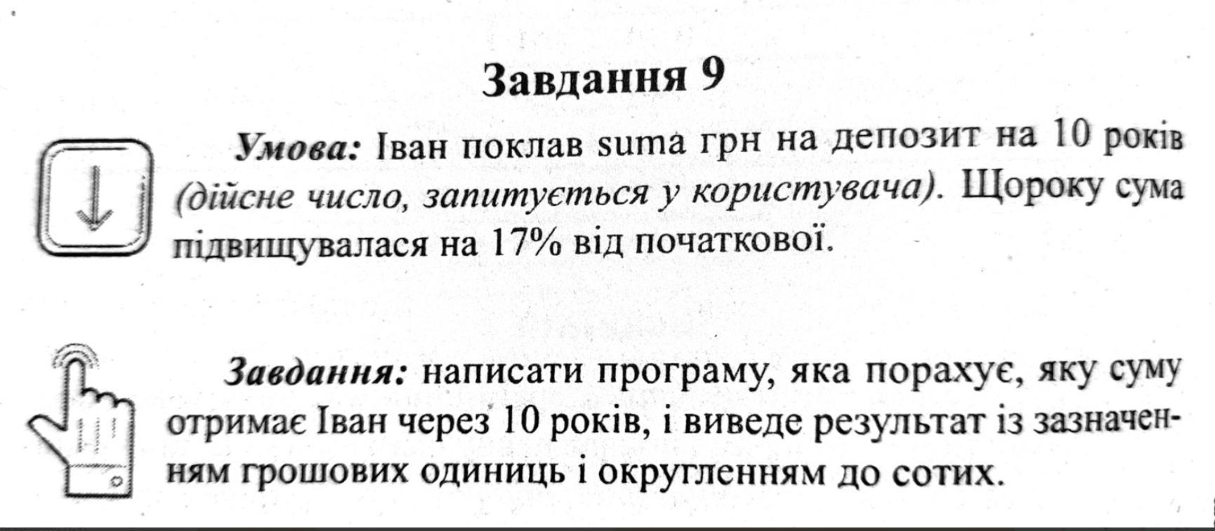 Завдання: написати програму, яка порахує, яку суму отримає Іван через 10 років, і виведе результат із зазначен- i ням грошових одиниць і округленням до сотих.