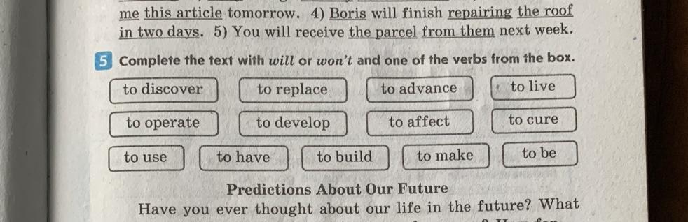 1) People ... in flats and houses like we have nowadays. They ... environmentally friendly «smart houses». 2) Scientists ... new cheap sources of energy. This discovery ... it possible to travel long distances not only around our planet, but also in space. 3) People .. their computers with the help of a keyboard or a mouse. They … the power of their thoughts to surf the Net. 4) 3D holographic displays ..