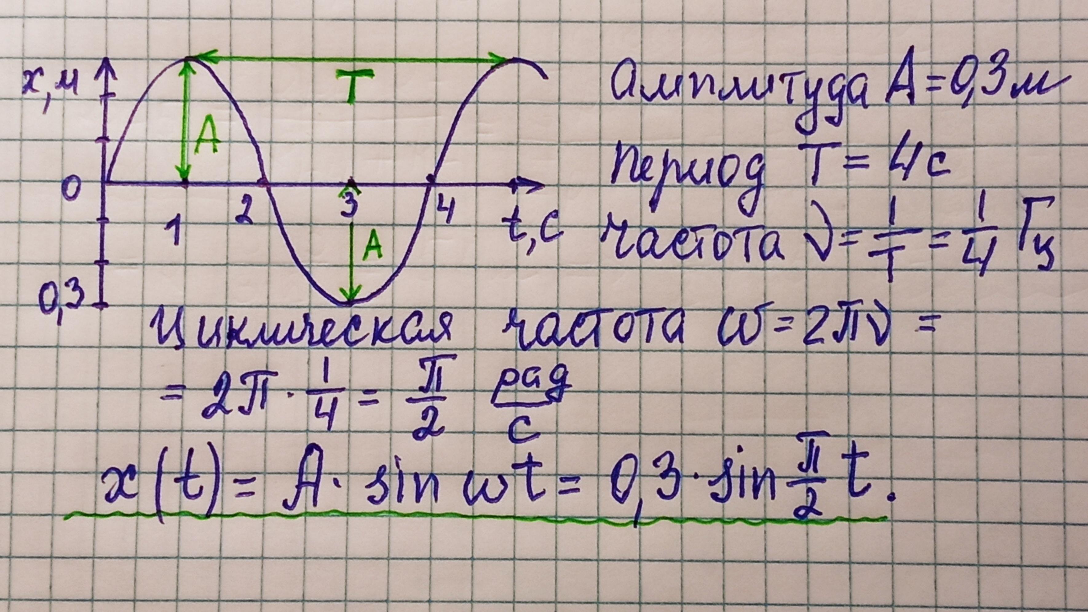 За графіком гармонічного коливального руху визначити амплітуду, період та частоту коливань. Записати рівняння коливального руху.