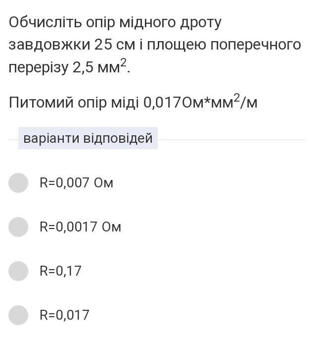 R = 0,0170 Ом·мм²/м · 0,25 м / 2,5 мм² = 0,0017 Ом