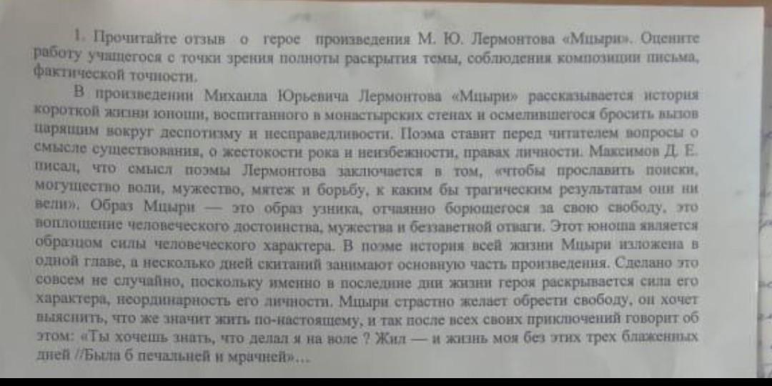 Данный отзыв по произведению Лермонтова «Мцыри»,написан очень хорошо и детально,видно,что человек который писал данный отзыв проникся всей душой и смыслом данного произведения.Я считаю,что этот отзыв данного произведения был хорошого и детально раскрыт,автор данного отзыва написал про героя,как и кем он является,указал на образ персонажа в виде узника который отчаянно боролся за свободу,указав,что это одно из человеческих достоинств и качеств,мужества и отваги.Так же автор данного отзыва написал речь героя,что означает,что то был внимателен во время чтения: «Ты хочешь знать,…»Как я считаю,этот отзыв хорошо написан и в будущем,люди обязательно прочитают его как и само произведение.