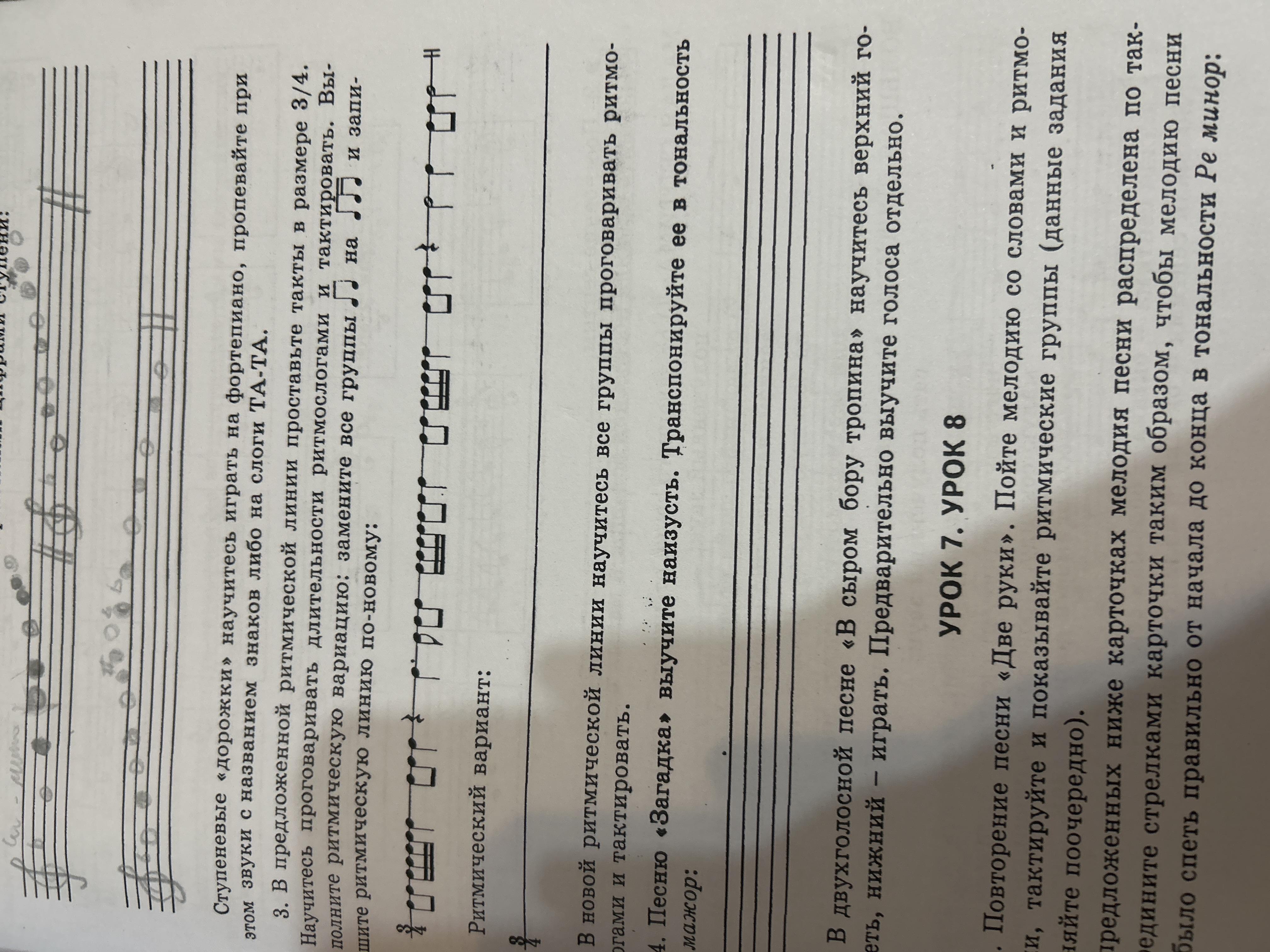 Научитесь проговаривать длительности ритмослогами и тактировать. Выполните ритмическую вариацию: замените все группы . ; на и запи-шите ритмическую линию по-новому