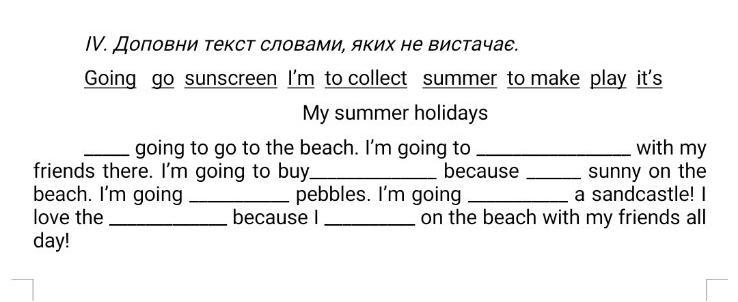 I'm going to go to the beach. I'm going to go with my friends there. I'm going to buy sunscreen because it's sunny on the beach. I'm going to collect pebbles. I'm going to make a sandcastle! I love the summer because I play on the beach with my friends all day!