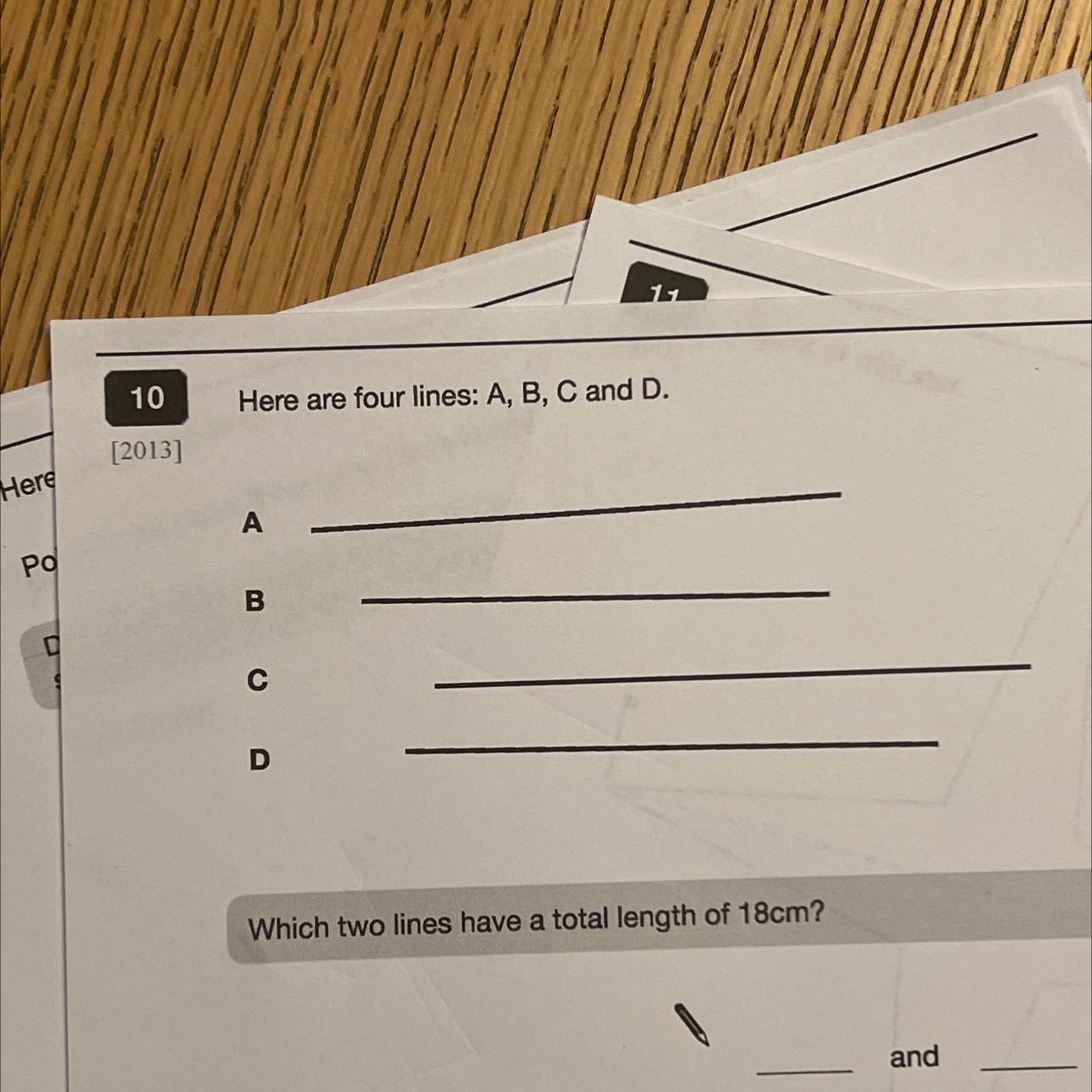 Вам нужно померять линейкой каждую линию и желательно, чтобы не забыть число и не допустить ошибок подписать, какой длины каждая линия. Далее Вам следует найти две линии, сумма которых 18. К примеру, если линия А=8 см, линия B равна 7 см, линия С равна 10 см, а линия D равна 4 см, то логично предположить, что сумма 8 и 10 равна 18.