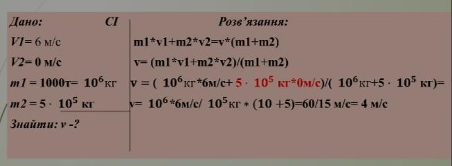 Швидкість криголама масою 1000 т, який рівномірно рухався з вимкненим двигуном, становила 6 м/с. Після зіткнення з нерухомою крижиною криголам продовжив рівномірний прямолінійний рух разом із нею. Маса крижини становить 5 - 105 кг. Яка швидкість сумісного руху обох тіл? Тертям між водою і криголамом знехтуйте. Уважайте, що вода стояча, течій немає.