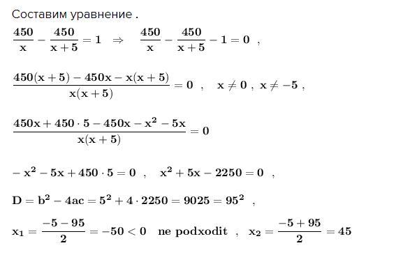 Время, за которое 2-ой поезд проехал 450 км , равно 450/(х+5) часов .