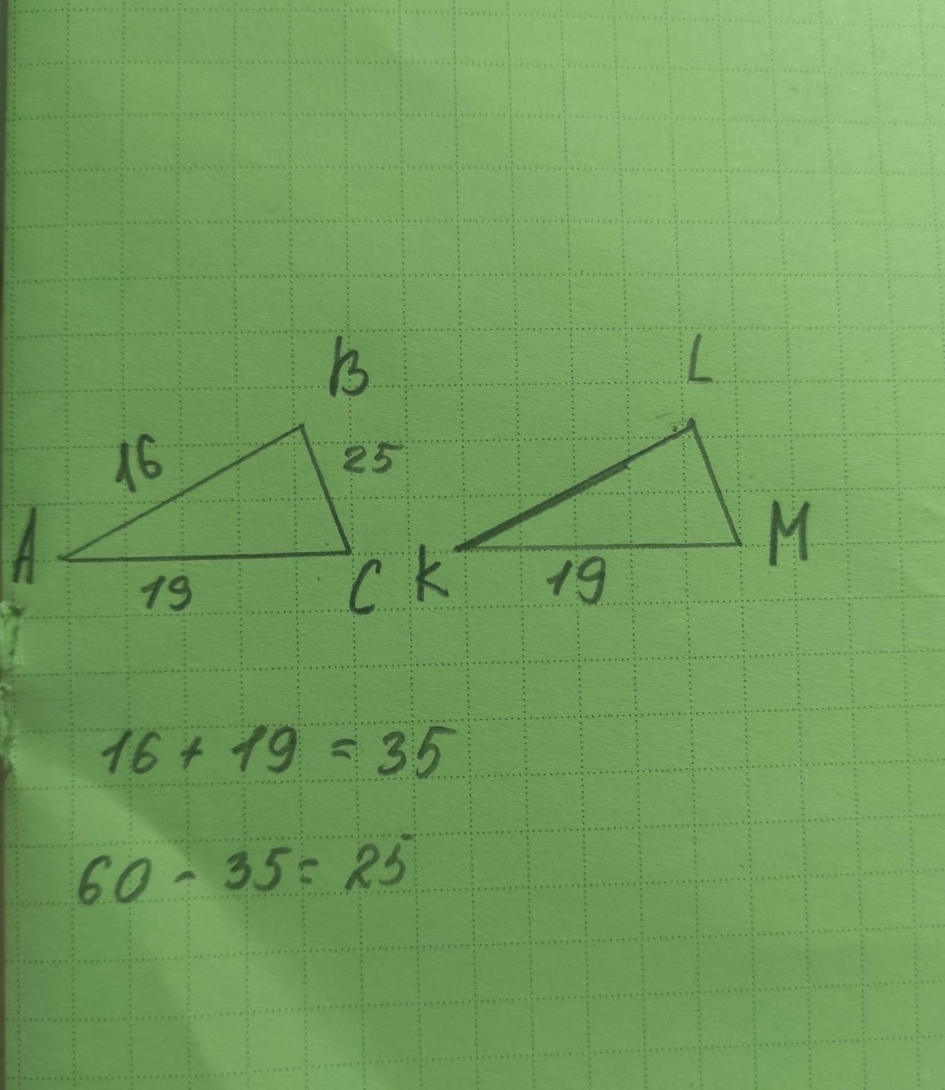 У рiвних трикутниках ABC i KLM AB=16 см, КМ-19 см, а периметр трикутника АВС дорівнює 60 см. Знайдіть сторону: BC