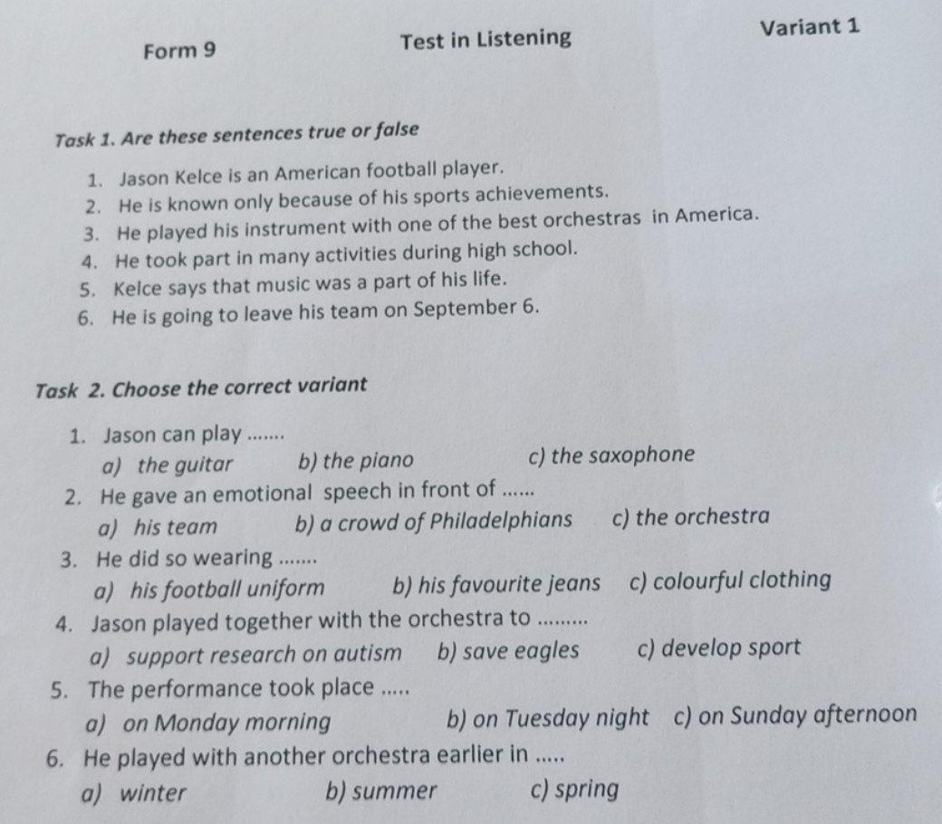 Task 1. Are these sentences true or false 1. Jason Kelce is an American football player. 2. He is known only because of his sports achievements. 3. He played his instrument with one of the best orchestras in America. 4. He took part in many activities during high school. 5. Kelce says that music was a part of his life. 6. He is going to leave his team on September 6. Task 2. Choose the correct variant 1. Jason can play. a) the guitar b) the piano c) the saxophone 2. He gave an emotional speech in front of ...... a) his team b) a crowd of Philadelphians c) the orchestra c) colourful clothing 3. He did so wearing a) his football uniform b) his favourite jeans 4. Jason played together with the orchestra to a) support research on autism b) save eagles c) develop sport 5. The performance took place ..... a) on Monday morning 6. He played with another orchestra earlier in ...... a) winter b) summer b) on Tuesday night c) on Sunday afternoon c) spring .