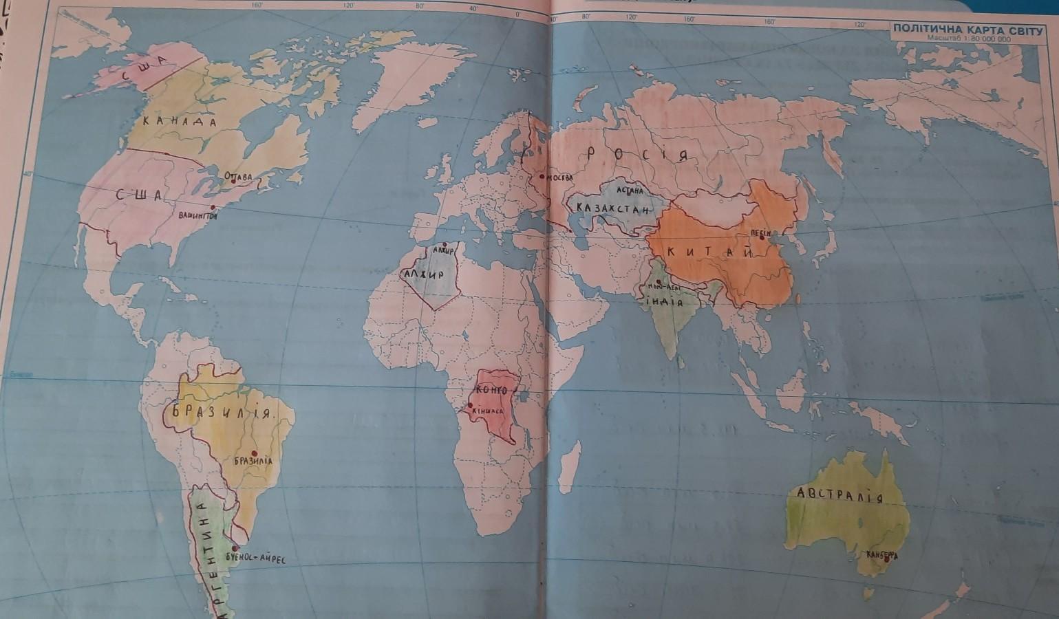 Завдання 2. За політичною картою півкуль знайдіть, позначте та підпишіть на контурній карті країни та столиці країн: Канада (Оттава); США (Вашингтон); Мексика (Mexiko); Бразилія (Бразиліа); Аргентина (Буенос-Айрес); Велика Британія (Лондон); Франція (Париж); Німеччина (Берлін); Італія (Рим); Туреччина (Анкара); Росiя (Москва) Індія (Нью-Делi); Китай (Пекін); Японія (Токіо); Австралія (Канбера).