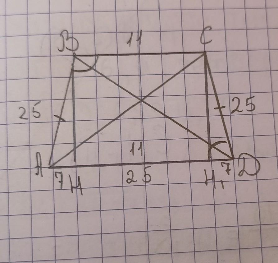 9. У рівнобічній трапеції діагональ є бісектрисою тупого кута, а основи становлять 11 см і 25 см. Знайти площу трапеції.