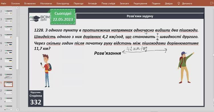 1)4,2÷7×6=3,6 (км/год)-швидкість другого пішохода;