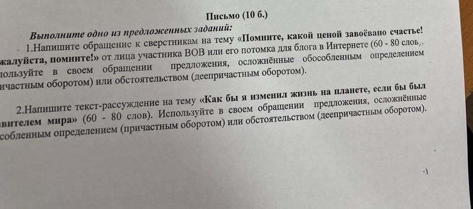 Письмо (10 б.) Выполни предложенных заданий: 1.Напишите обращение к сверстникам на тему «Помните, какой ценой завоёвано счастье! жалуйста, помните!>> от лица участника ВОВ или его потомка для блога в Интернете (60 - 80 слоБ,. пользуйте ичастным определением в своем оборотом) обращении предложения, осложнённые обособленным или обстоятельством (деепричастным оборотом