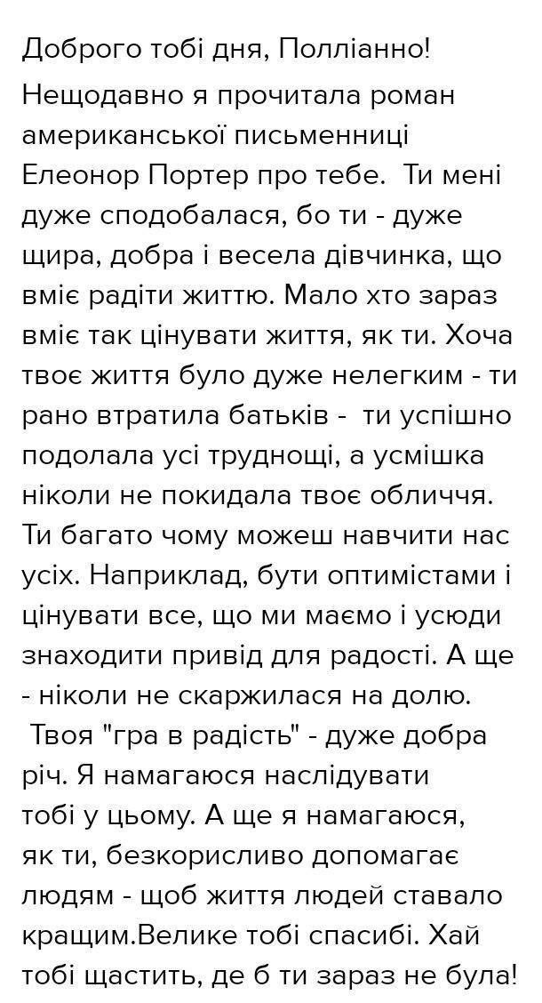 Треба Написати листа Полліаннє. Можна на окремому аркуші, гарно оформити (звертання, висловити свої почуття, побажання, захоплення ії поведінкою).
