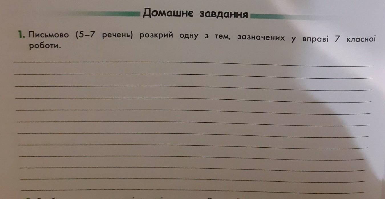 Письмово (5-7 речень) розкрий одну з тем,зазначених у вправі 7 класної роботи.
