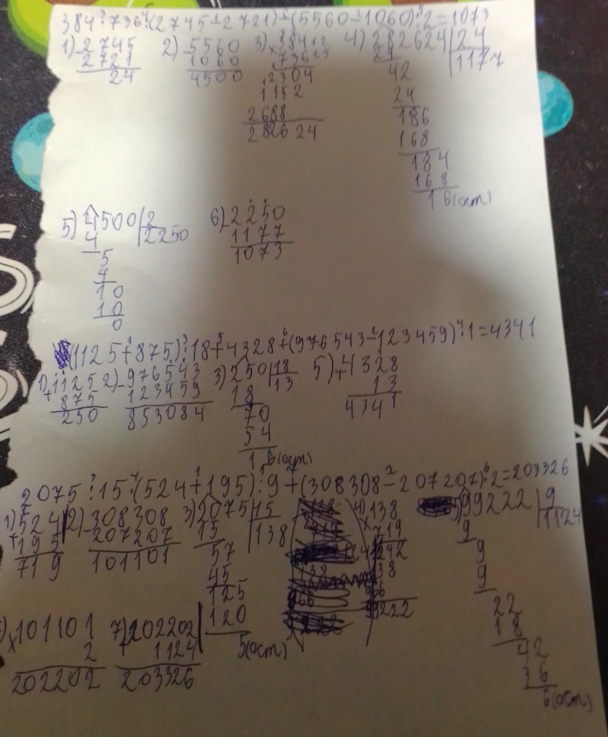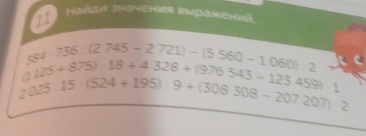 11 ДОМАШНЕЕ ЗАДАНИЕ Найди значения выражений столбиком пж 384-736:(2 745 - 2 721) - (5 560 - 1 060): 2 2025:15 (524 +195): 9 + (308 308 - 207 207)-2 (1125+875) - 18 + 4 328+ (976 543 - 123 459)-1