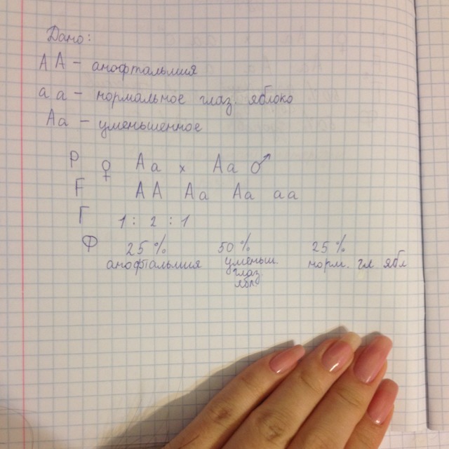 Помогите пожалуйста!!!!!!!Срочно!!!!!!Анофтальмия (безглазие) - это болезнь, за возникновение которой отвечает доминантный ген неполного доминирования, локализованный в одной из пар аутосом. При этом особи, имеющие гомодоминантный генотип, страдают безглазием. При гоморецессивном генотипе человек имеет нормальный размер глазного яблока, а обладатель гетерозиготного генотипа характеризуется наличием уменьшенного размера глазного яблока.