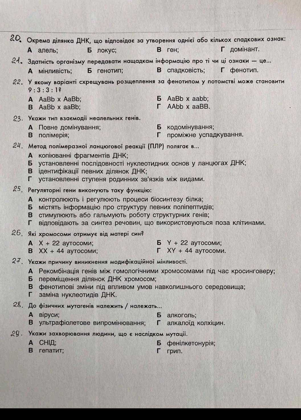 Відповідь:20) В 21) В 22) А 23) В 24) А 25) В 26) А 27) В 28) В 229)