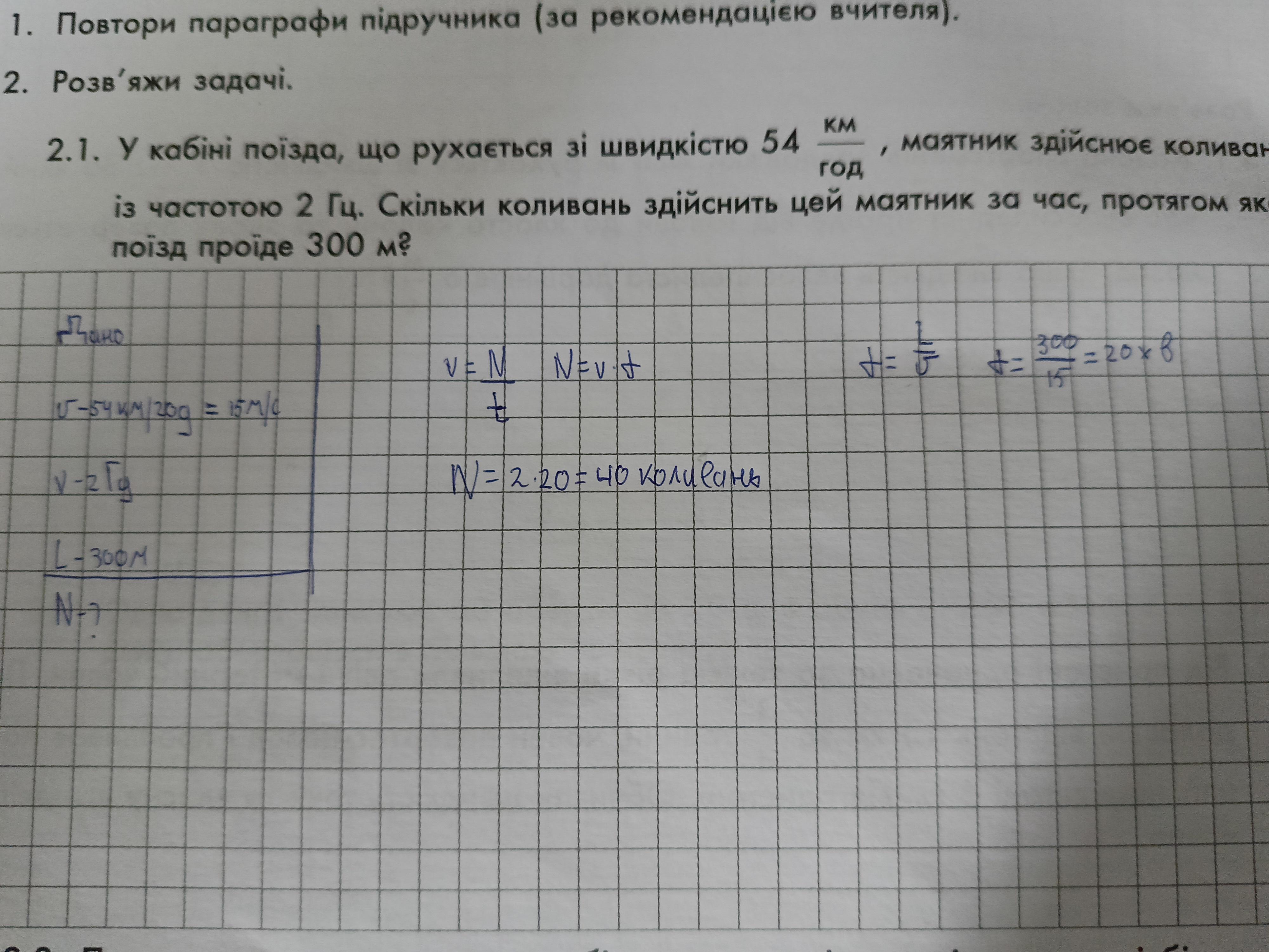 KM 2.1. У кабіні поїзда, що рухається зі швидкістю 54 маятник здійснює коливання год iз частотою 2 Гц. Скільки коливань здійснить цей маятник за час, протягом якого Поїзд проїде 300 м? I