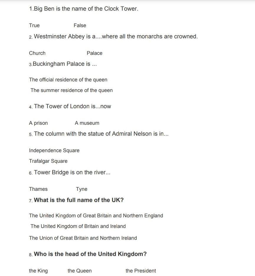 1.Big Ben is the name of the Clock Tower. True False 2. Westminster Abbey is a....where all the monarchs are crowned. Palace 3.Buckingham Palace is ... Church The official residence of the queen The summer residence of the queen 4. The Tower of London is...now A prison 5. The column with the statue of Admiral Nelson is in... A museum Independence Square Trafalgar Square 6. Tower Bridge is on the river... Thames Tyne 7. What is the full name of the UK? The United Kingdom of Great Britain and Northern England The United Kingdom of Britain and Ireland The Union of Great Britain and Northern Ireland 8. Who is the head of the United Kingdom? the King the Queen the President