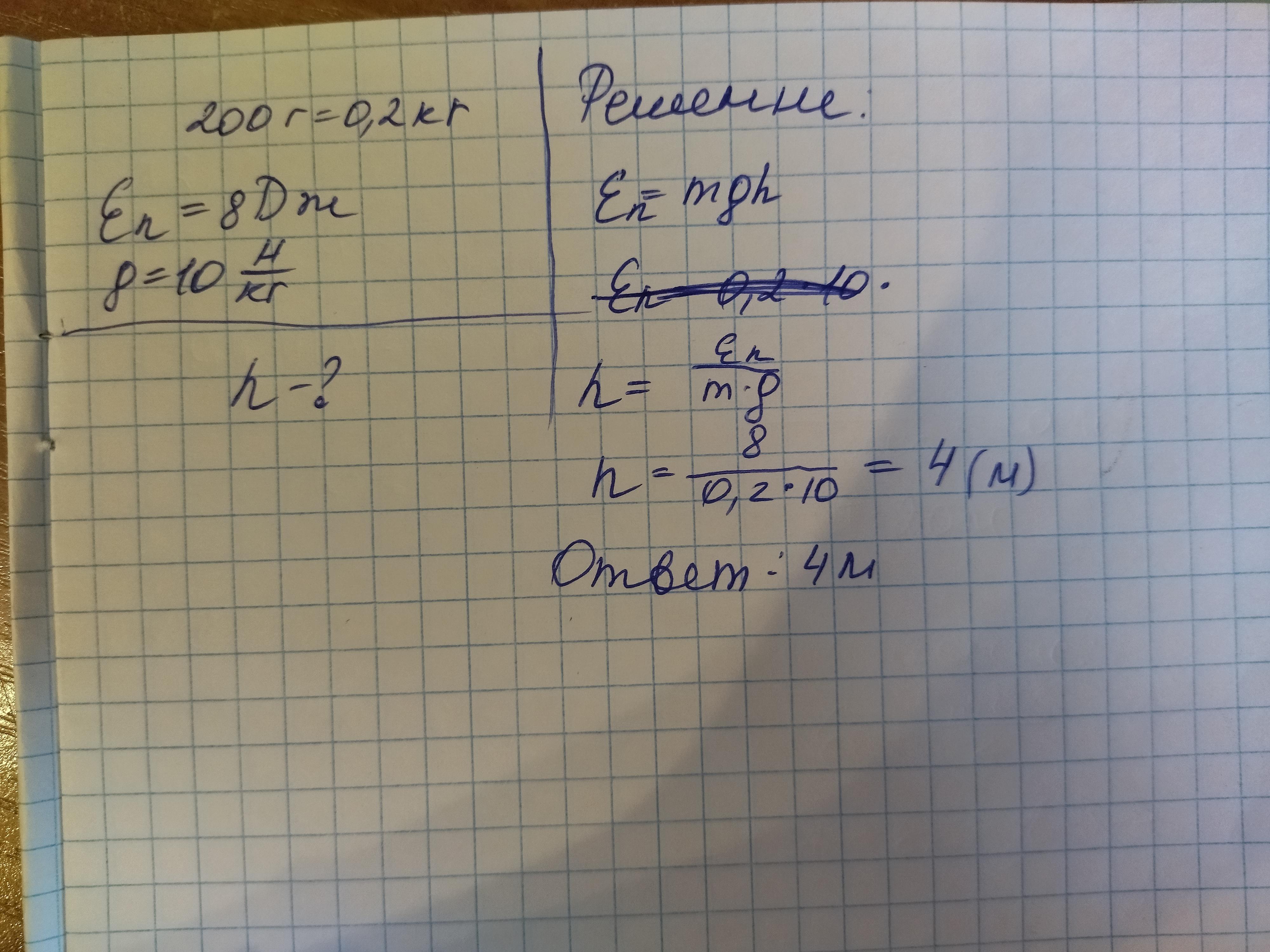 Eп=mgh→h=Eп/(gm)=8/10*0,2=4м