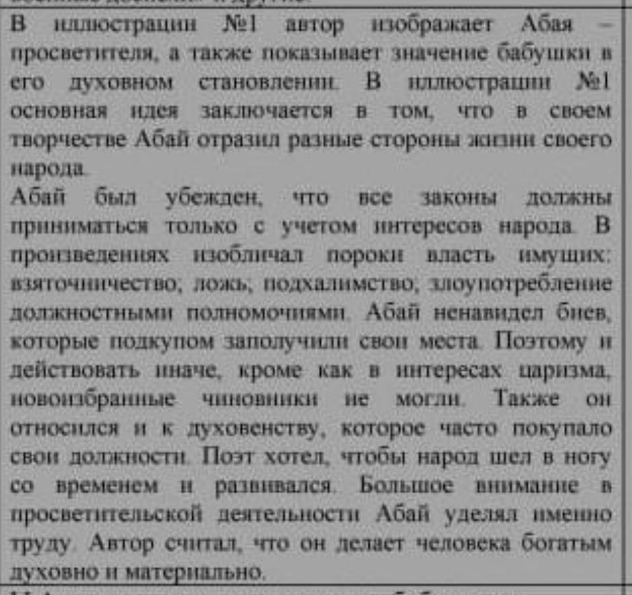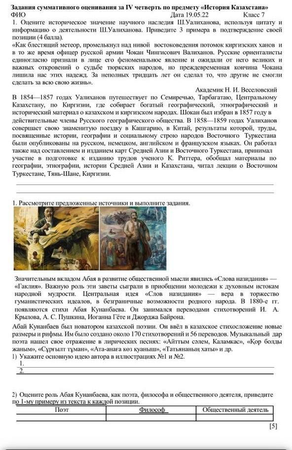 1. Рассмотрите предложенные источники и выполните задания. В - вера B торжество Значительным вкладом Абая в развитие общественной мысли явились «Слова назидания>> «Гаклия>>. Важную роль эти заветы сыграли в приобщении молодежи к духовным истокам народной мудрости. Центральная идея «Слов назидания>> гуманистических идеалов, в безграничные возможности родного народа. В 1880-е гг. появляются стихи Абая Кунанбаева. Он занимался переводами стихотворений И. А. Крылова, А. С. Пушкина, Иоганна Гёте и Джорджа Байрона. Абай Кунанбаев был новатором казахской поэзии. Он ввёл в казахское стихосложение новые размеры и рифмы. Им было создано около 170 стихотворений и 56 переводов. Музыкальный дар поэта нашел свое отражение в лирических песнях: «Айттым сәлем, Каламкас», «Кор болды жаным», «Сургылт туман>>, > и др. 1) Укажите основную идею автора в иллюстрациях №1 и №2 I. 2. 2) Оцените роль Абая кунанбаева, как поэта, философа и общественного деятеля, приведите по 1-му примеру из текста к каждой позиции. Поэт Философ Общественный деятель ПОЖАЛУЙСТА ДАМ 40 БАЛЛОВ