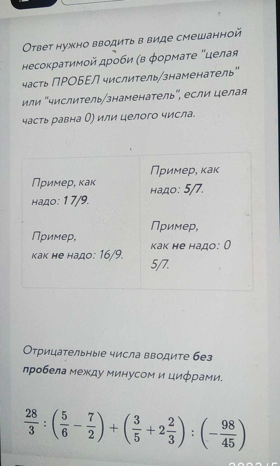 "28/3"/("5/6" - "7/2") + ("3/5" + "2 2/3") / ("-98/45")